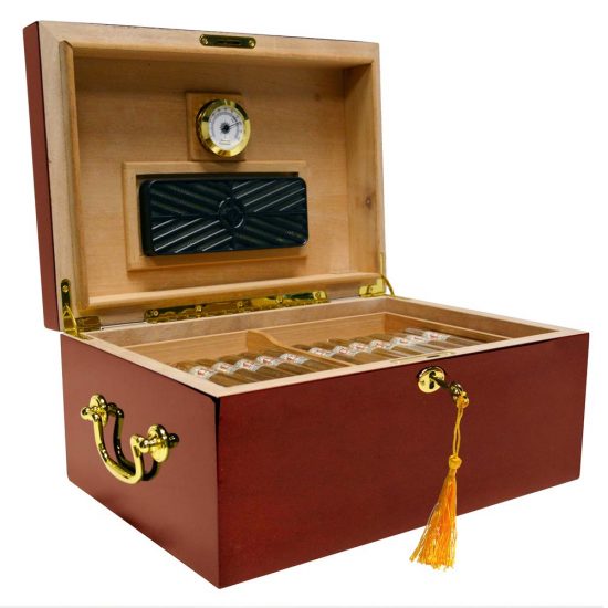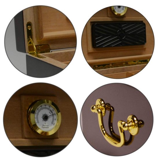 The humidor built with SureSeal technology to protect and preserve your cigars for years to come. Equipped with top mounted hygrometer, side mounted golden carry handles, and scratch resistant bottom.